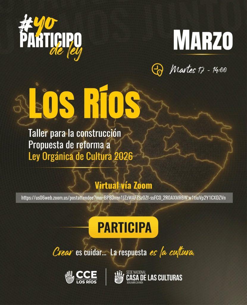 Debido a las fuertes inundaciones que afectan a la provincia de Los Ríos, el núcleo local de la Casa de la Cultura Ecuatoriana desarrolló de manera virtual el taller de la campaña “Yo participo de Ley: la cultura también decide”, garantizando la participación de artistas y gestores culturales pese a las dificultades de movilidad.
